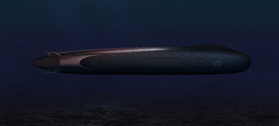 The SMX31E could also serve as a mothership for a plethora of Autonomous Underwater Vehicles/Unmanned Underwater Vehicles (AUV/UUV) of varying sizes. Two large mission bays will host large AUV, while additional smaller vessels could be carried in the weapon storage. The SMX31E will feature torpedo tubes and be able to carry up to 24 heavyweight torpedoes or a mix of weapons and unmanned assets. Thanks to such capabilities, Naval Group estimates that the concept submarine could have up to ten times the surveillance capability of a BARRACUDA-class boat.